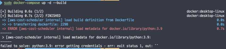 Docker Docker - failed to solve: ~~~: error getting credentials - err: exit status 1, out: `` 에러 - 개요 MacOS 환경에서 docker-compose 사용 시 해당 에러가 발생했다. => ERROR [~~~ internal] load metadata for docker.io/library/~~~ 0.7s ------ > [~~~ internal] load metadata for docker.io/library/~~~: ------ failed to solve: ~~~: error getting credentials - err: exit status 1, out: `` 해결방법 docker 설정의 credsStore부분을 변경한다 파일 경로 : ~/.docker/config.json sudo vi ~/.docker/config.json 위 명령어로 들어간 파일의 내용 중 credsStore 부분이 desktop으로 되어있다면 osxkeychain, osxkeychain으로 되어있다면 desktop으로 수정한다. { "auths": { "https://index.docker.io/v1/": {} }, "credsStore": "osxkeychain" or "desktop", "currentContext": "desktop-linux" } 참고 ERROR: failed to solve: error getting credentials - err: exit status 1, out: `` This is the topic I mentioned before Try what I described there to make the docker command executable again. Out of curiosity, did you install Docker Desktop as root? I know HomeBrew can also install Docker desktop but if you run it as root it might break forums.docker.com 반응형 공유하기 게시글 관리 Aleph Kim의 IT 블로그 Contents 당신이 좋아할만한 콘텐츠 docker - docker compose networks 옵션과 드라이버 종류 2025.03.04 Docker - Nginx Proxy Manager(npm) Docker로 실행하기 2024.08.14 Docker - Docker + Spring Boot + Github Action CICD 2024.06.27 Docker - nginx 서버 구동 2024.06.04 댓글 0 + 이전 댓글 더보기
