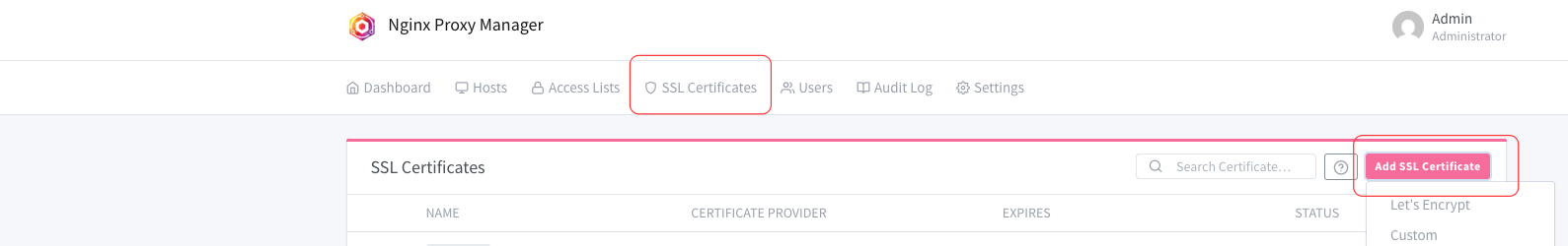 1. NPM의 SSL Certificates 탭의 Add SSL Certificate 버튼을 클릭한다.