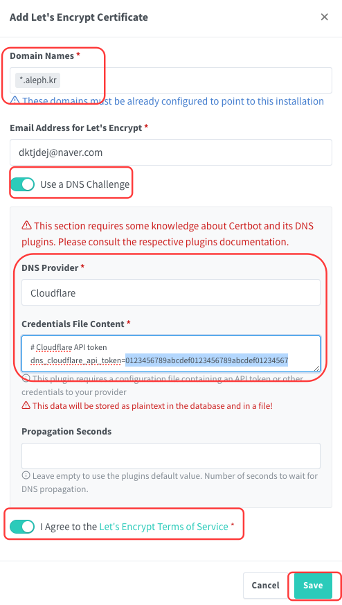 Credentials File Content에 api_token 부분을 복사한 토큰으로 수정