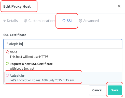 3. 기존 proxy host를 수정하거나 새 proxy host를 추가할때 ssl 탭에서 SSL Certificate를 저장한 인증서로 저장해준다.